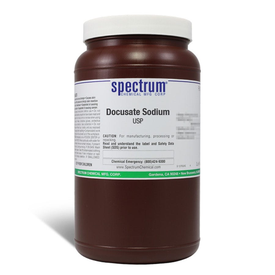 Size quantity: 1-EA Description: Docusate Sodium, USP. Spectrum Chemical graded products (USP/NF, EP, BP, JP, FCC) are handled, packaged, labeled, stored, and tested in FDA registered and inspected facilities. All operations are conducted in compliance with current Good Manufacturing Practices (cGMP) as defined in 21 CFR Parts 210 and 211. Furthermore, the original manufacturers of these materials adhere to appropriate GMP standards, such as ICH Q7 Good Manufacturing Practice Guide for Active Pharmaceutical Ingredients or FDA 21 CFR Parts 210 and 211, ensuring the highest quality and regulatory compliance throughout the supply chain.
