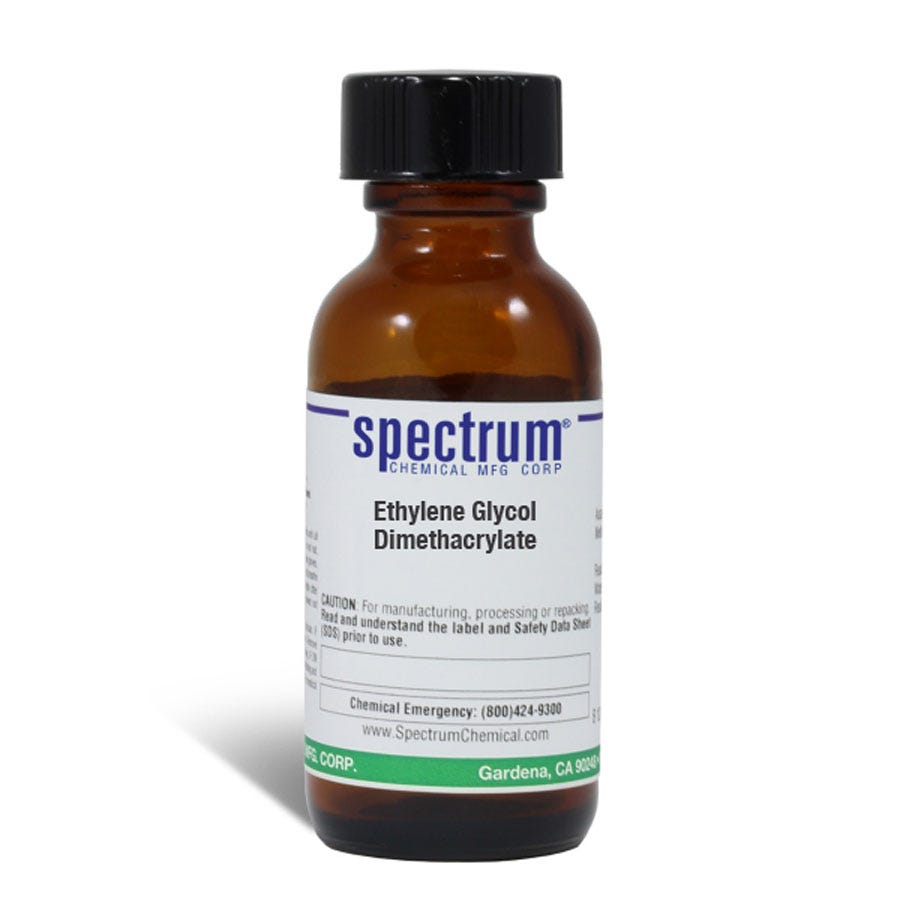 Size quantity: 1-EA Description: Ethylene Glycol Dimethacrylate is a diester that is formed by the condensation of ethylene glycol and methacrylic acid and used primarily in free radical copolymer crosslinking reactions. Ungraded products supplied by Spectrum are indicative of a grade suitable for general industrial use or research purposes and typically are not suitable for human consumption or therapeutic use.