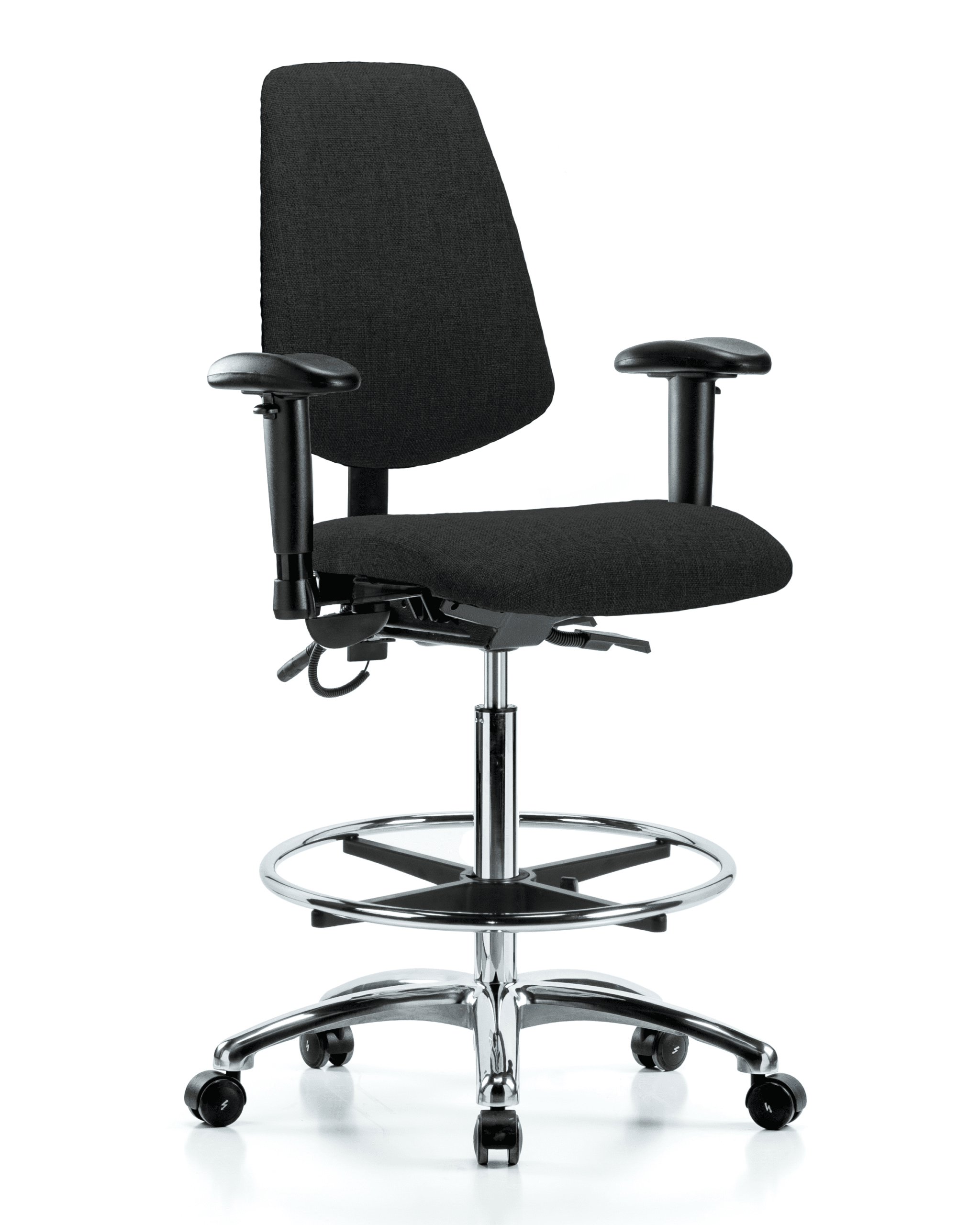 Fabric ESD Chair – High Bench Height with Medium Back, Seat Tilt, Adjustable Arms, Chrome Foot Ring, & ESD Casters in ESD Black Fabric
