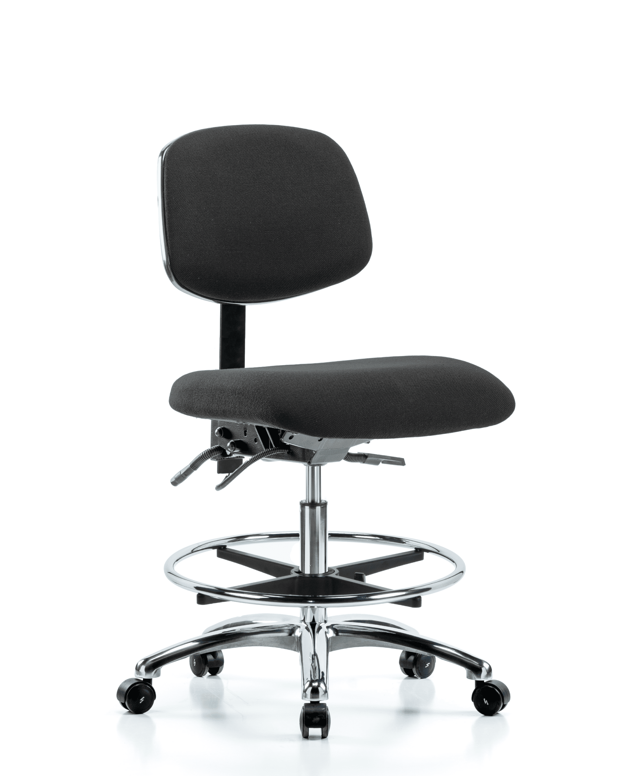Description : Fabric ESD Medium Bench Height Chair in Chrome is adjustable from 21.5-29 inches from the top of the seat to the floor and features ergonomic adjustments including seat height and locking back tilt, electro-static dissipating components to ensure proper grounding, chrome adjustable foot ring, locking seat tilt, and cast-aluminum base with dual-wheel, self-braking, non-marring ESD casters suitable for hard floors in electro-static dissipating fabric.