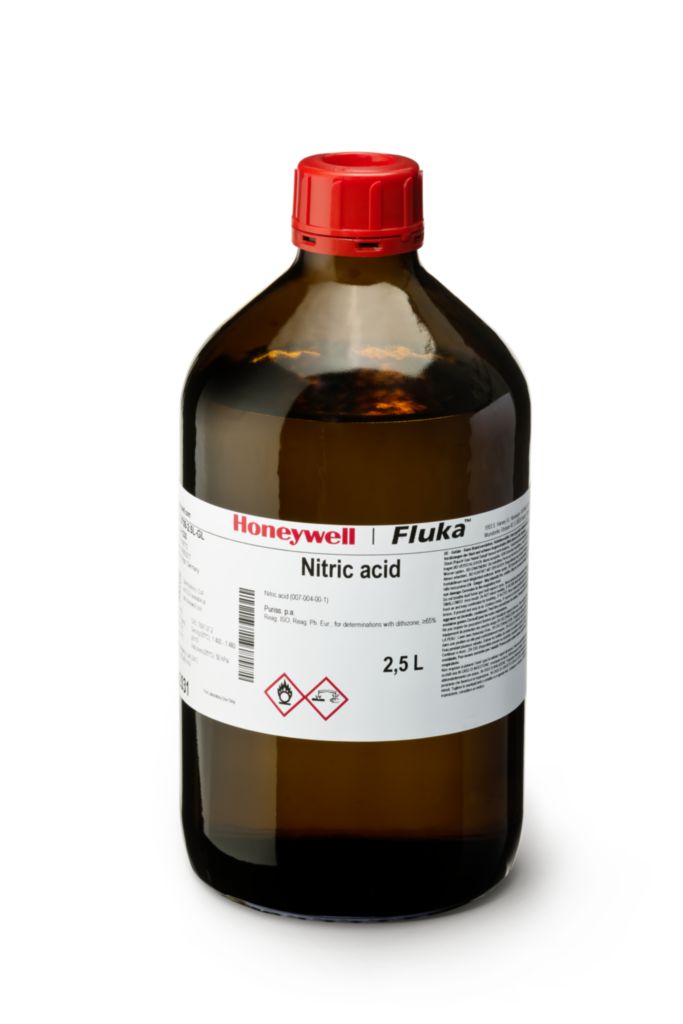 Description : Nitric acid 2.5L. Nitric acid, Purity: /=65%, Grade: Puriss. P.a, Reag. ISO, Reag. Ph. Eur, Cas: 7697-37-2, MF: HNO3, Molar Mass: 63.01 g/mol, Synonym: Laboratory Chemical, Color/Form: Colorless to Almost Colorless Liquid, Application: Determinations wit