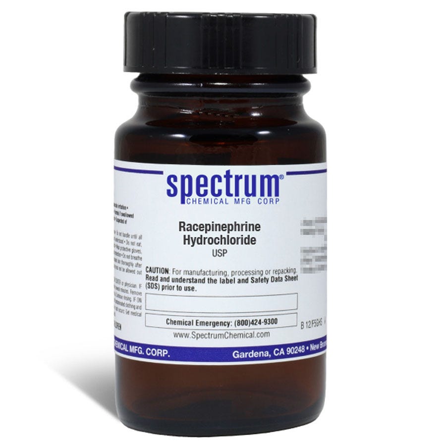Size quantity: 1-EA Description: Racepinephrine Hydrochloride, USP. Spectrum Chemical graded products (USP/NF, EP, BP, JP, FCC) are handled, packaged, labeled, stored, and tested in FDA registered and inspected facilities. All operations are conducted in compliance with current Good Manufacturing Practices (cGMP) as defined in 21 CFR Parts 210 and 211. Furthermore, the original manufacturers of these materials adhere to appropriate GMP standards, such as ICH Q7 Good Manufacturing Practice Guide for Active Pharmaceutical Ingredients or FDA 21 CFR Parts 210 and 211, ensuring the highest quality and regulatory compliance throughout the supply chain.