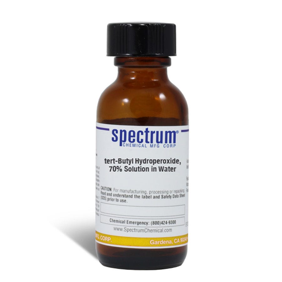 Size quantity: 1-EA Description: tert-Butyl Hydroperoxide, 70 Percent Solution in Water, with a systematic name of tert-Butyl hydroperoxide, is used in a variety of oxidation processes. Ungraded products supplied by Spectrum are indicative of a grade suitable for general industrial use or research purposes and typically are not suitable for human consumption or therapeutic use.