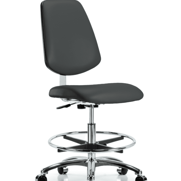 Class 10 Clean Room Vinyl Chair Chrome – Medium Bench Height with Medium Back, Chrome Foot Ring, & Casters in Charcoal Trailblazer Vinyl