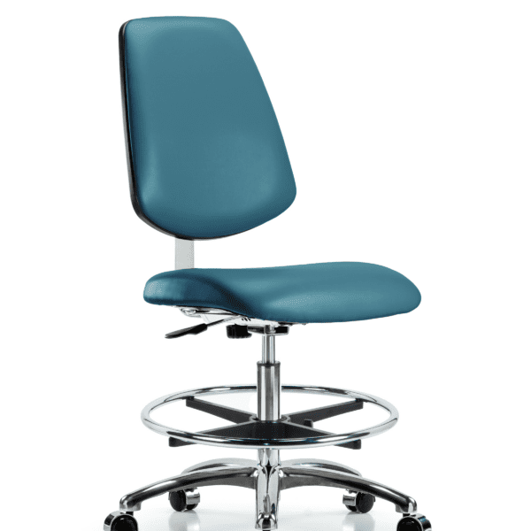 Class 10 Clean Room Vinyl Chair Chrome – Medium Bench Height with Medium Back, Chrome Foot Ring, & Casters in Marine Blue Supernova Vinyl