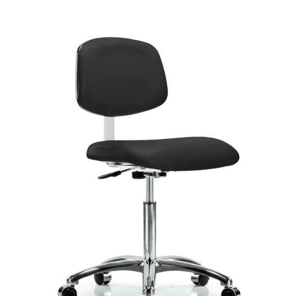 Class 10 Clean Room Vinyl Chair Chrome – Medium Bench Height with Casters in Black Trailblazer Vinyl